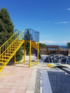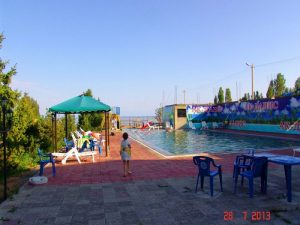 Пляж песчаный и достаточно просторный, имеется зонтики. Вход в воду мелко-каменистый, пирса нету.