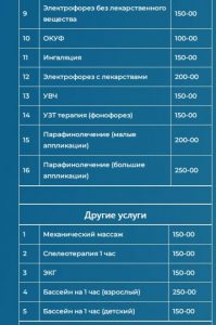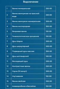 В перечень медицинских услуг входят функциональная диагностика широкого спектра, включающая лабораторные исследования, физиотерапия, бальнеологическое лечение с использованием воды минеральных источников, аппликации на основе иловых грязей, ингаляции и спелеотерапия для профилактики и лечения бронхо-легочных заболеваний, реабилитационная программа для людей с заболеваниями опорно-двигательного аппарата, лечебная сауна.